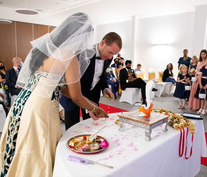 I never had a chance to physically meet my couple before the wedding ceremony as we went into lockdown so all the meetings were done on zoom. This included the initial meeting, the ceremony discussions and let’s not forget all the postponement discussions. Priya and Ben not only went through the postponements they also had a last-minute venue change but throughout all this, they remained calm and supported with each telephone call, email and zoom meeting. We were going to create a beautiful multicultural ceremony paying respect to each of their backgrounds. Indian and German.