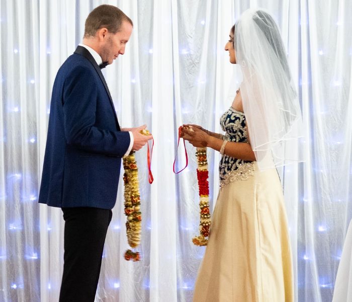 I had so much information now that I really wanted to start writing their wedding ceremony ensuring I had a balance of what to include. In the Hindu culture, we always start ceremonies with the Ganesh Puja and this is what we did with both Priya and Ben lighting the diwa and the incense stick. Then putting a garland on Ganesh and finally a red tikka and a few grains of rice on Ganesh’s forehead. By doing this, they have invited Lord Ganesh to be with them for the ceremony and remove any obstacles they may face.