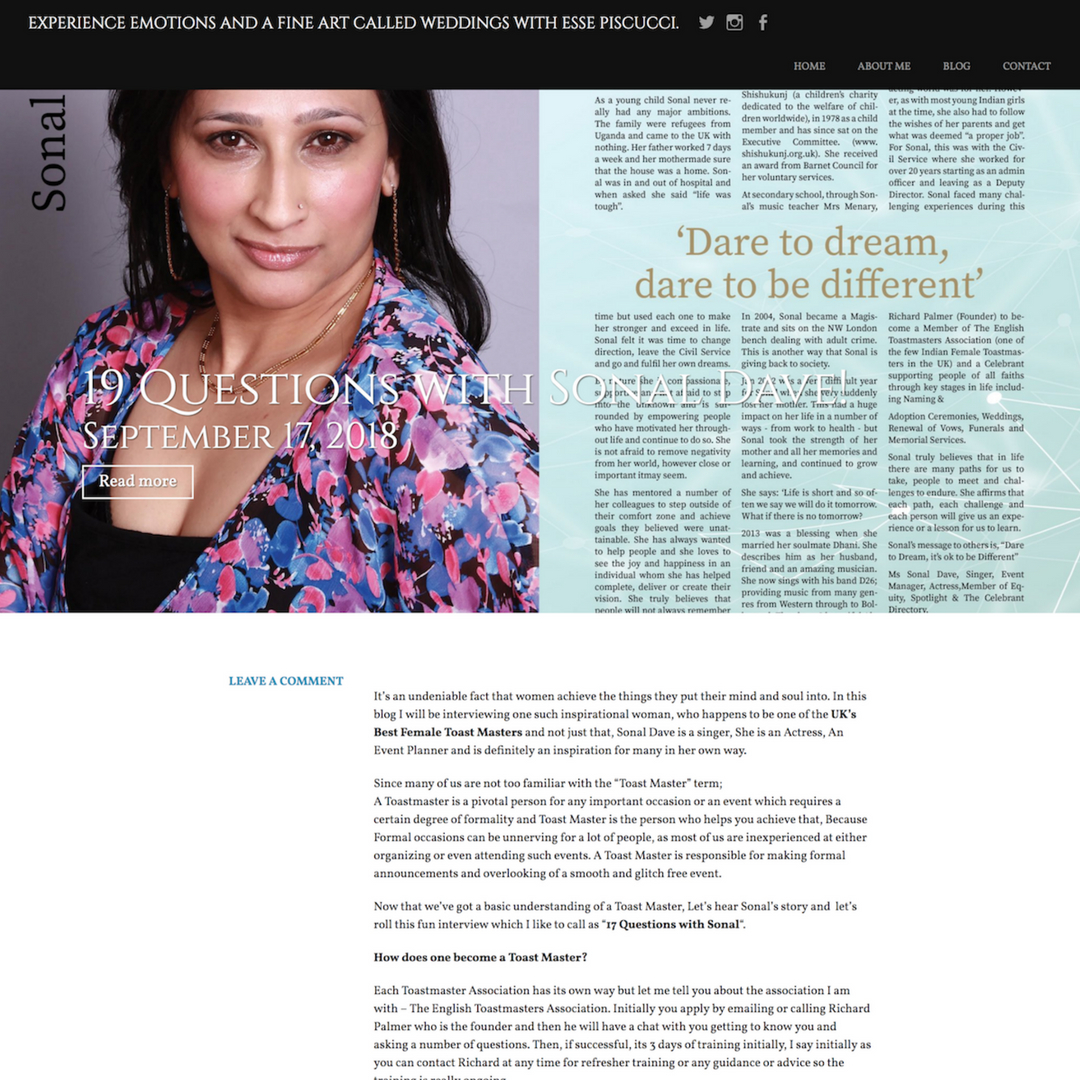 Professionally trained Toastmaster, Celebrant and Public Speaking Expert and a Member of the English Toastmasters Association and The Independent Association of Celebrants